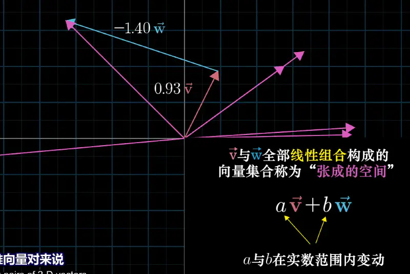 张成空间:给定基向量的所有线性组合的集合,将箭头看作点时,共线时为直线非共线为平面。 一组向量 \(\{v_1, v_2, \dots, v_k\}\)的张成空间是这些向量的所有可能线性组合的集合。 即: