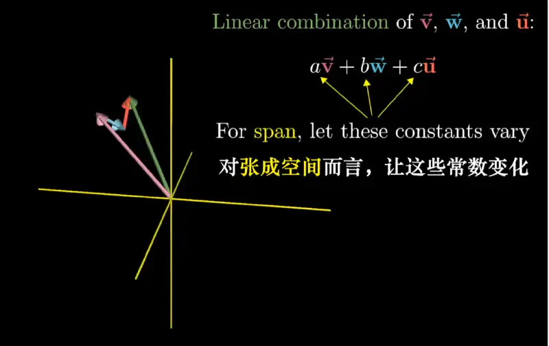 当三个向量非共面时,张成空间是整个三维空间,线性组合能组合成三维空间的任意向量.