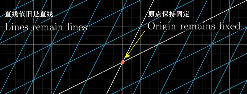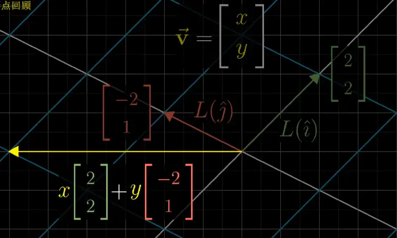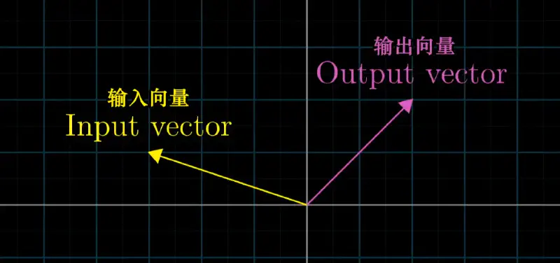 线性变换:输入一个向量输出一个向量。变换后网格保持平行且等距。线性变换是对空间的一种变换操作。