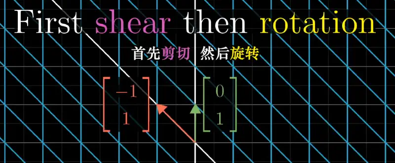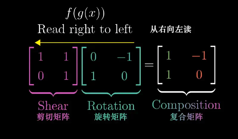 $$ \begin{bmatrix} 1 & 1 \\ 0 & 1 \end{bmatrix} \left( \begin{bmatrix} 0 & -1 \\ 1 & 0 \end{bmatrix} \begin{bmatrix} x \\ y \end{bmatrix} \right) \quad \text{——矩阵乘法。} $$由于这两种变换相同: