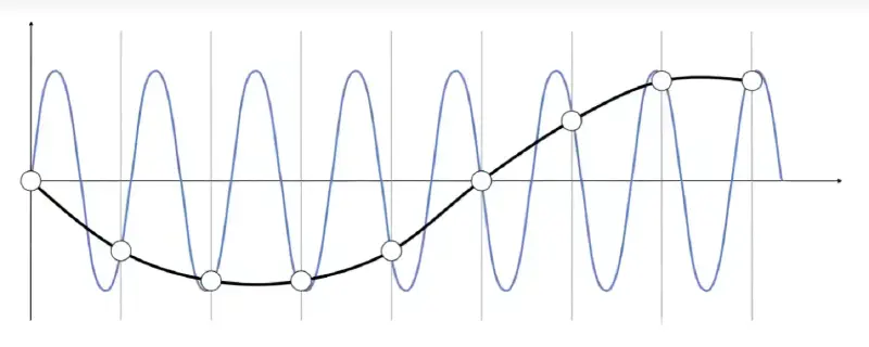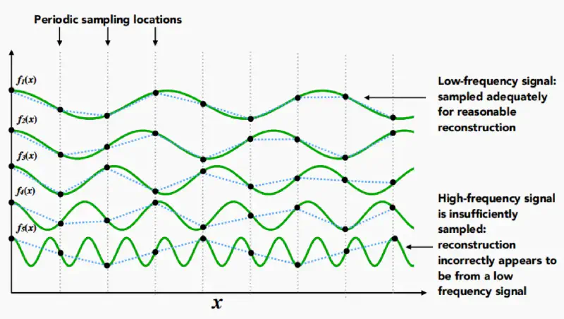 任何周期函数,都可以看作是不同振幅、相位的正弦波的叠加,比如某个周期函数经过傅里叶变换后得到下面五个函数的叠加,频率递增。用同样的采样频率采样这五个函数,随着信号频率递增,采样结果越来越表现不了原来信号的图像,所以更高频率的信号需要更快的采样速度!