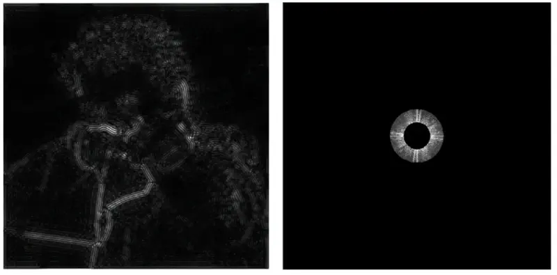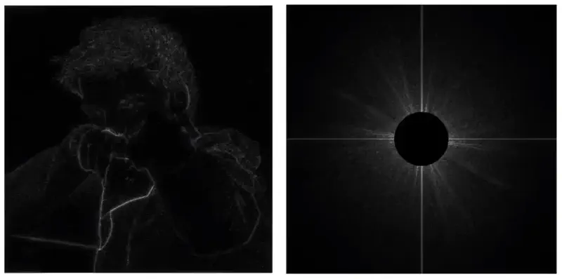- 本质:左图经 2D 傅里叶变换生成的幅度谱,是频率域表示