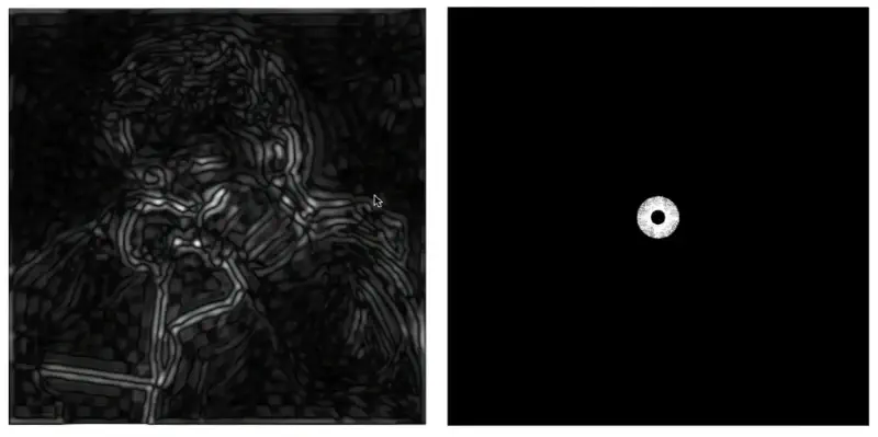 带通滤波,允许限定频段的波通过,通常是将一张图片经过傅里叶变换得到频域,然后去掉高于限定的最高频和低于限定的最低频信号,如下图中右侧,像一个圈圈一样,经过逆傅里叶变换就可以得到左侧的图像。