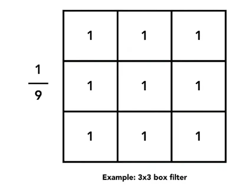 乘以1/9的原因——对处理结果进行归一化:卷积操作时原图像中的9个像素卷积盒中的元素分别相乘再相加,得到的是原来的9倍,会导致图像异常明亮。