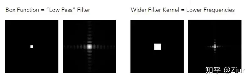 - 核越宽(空域越大),频域主瓣越窄,通带频率越低,模糊越强;核越窄,通带越宽,模糊越弱。