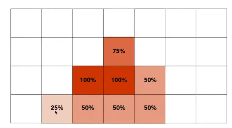 原本的inside(x,y,t)传入的点不再是像素中心点(x+0.5,y+0.5) 而是四个子采样点坐标(x+0.25,y+0.25),(x+0.25,y+0.75),(x+0.75,y+0.25),(x+0.75,y+0.75) 若一个像素被覆盖n个子采样点,则该像素 覆盖率 为(n/4)x100%