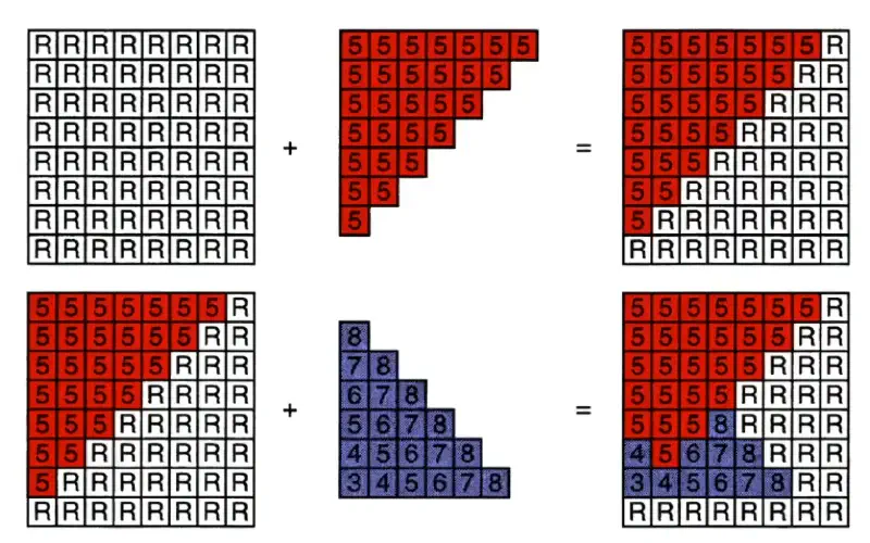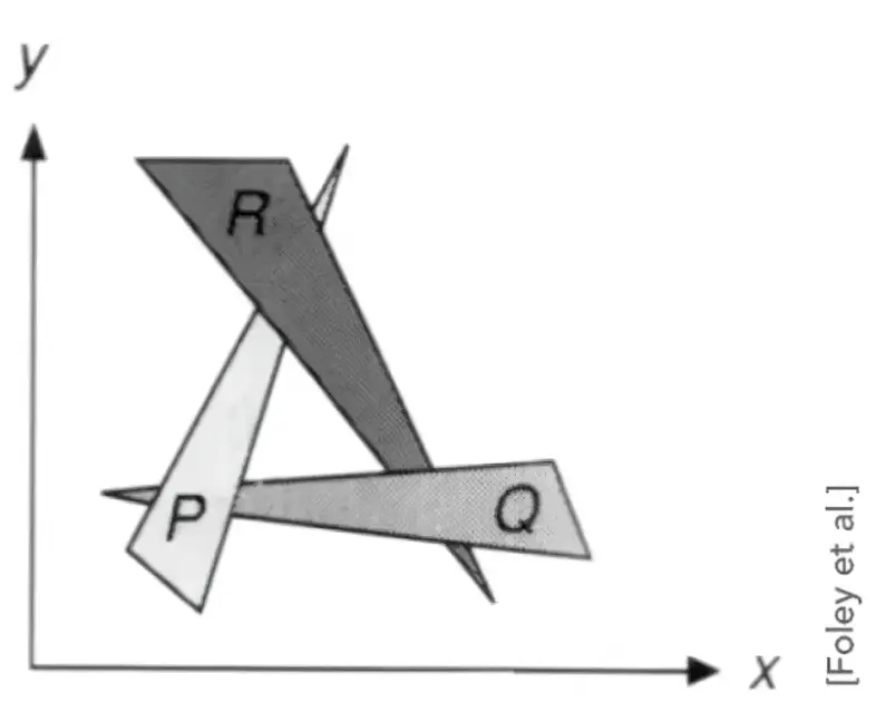 但是画家算法会碰到一个问题,不适合在计算机中绘制互相遮挡的图形,如下的三角形.