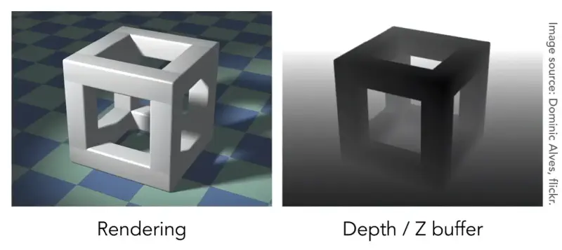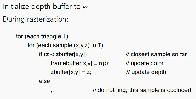 - 得到最终渲染图像的同时会有一个深度缓存产生 1、frame buffer 存放每个像素的颜色 2、depth buffer 存放每个像素的深度信息(也叫z-buffer)