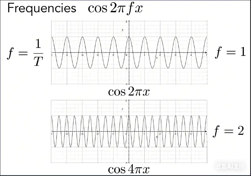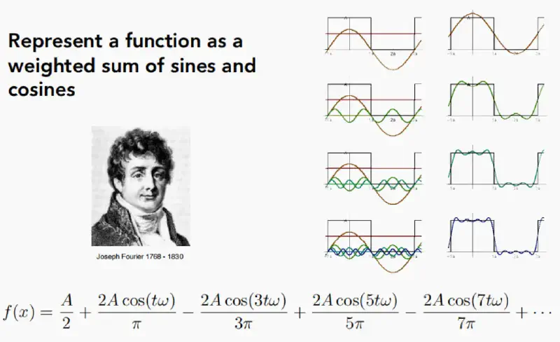 任何一个周期函数都可以写成一系列正余弦函数的组合+一个常数项,我们可以用傅里叶展开式来近似端数字的信号,随着展开项增多,图像会越来越接贴合。