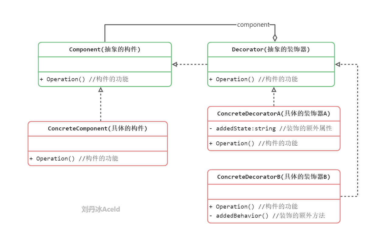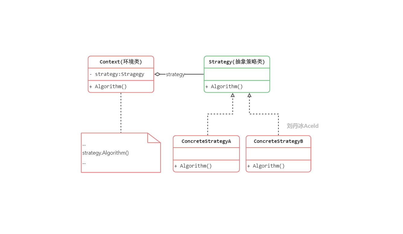 ConcreteStrategy(具体策略类):它实现了在抽象策略类中声明的算法,在运行时,具体策略类将覆盖在环境类中定义的抽象策略类对象,使用一种具体的算法实现某个业务处理。