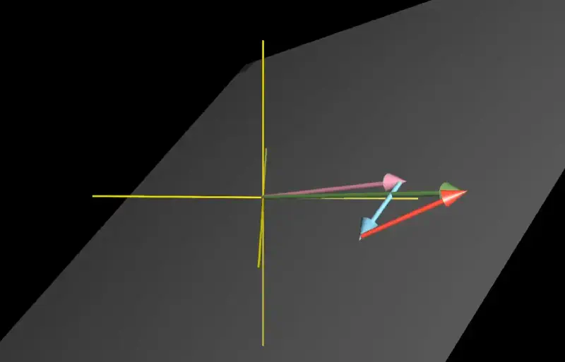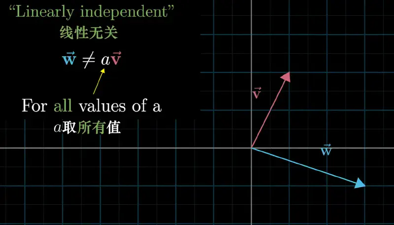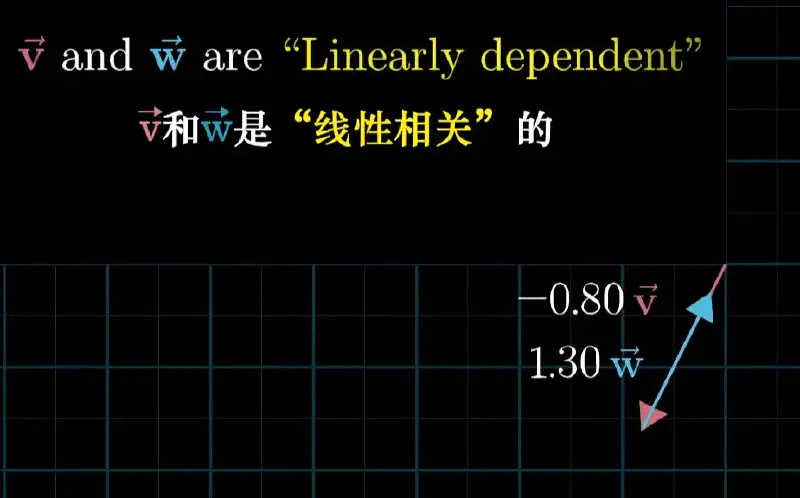 张成空间:给定基向量的所有线性组合的集合,将箭头看作点时,共线时为直线非共线为平面。 一组向量 \(\{v_1, v_2, \dots, v_k\}\)的张成空间是这些向量的所有可能线性组合的集合。 即: