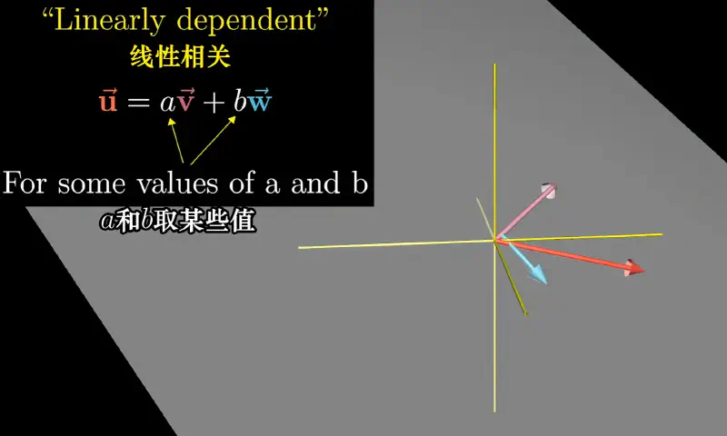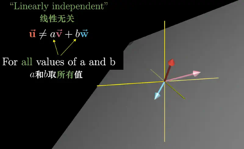 当三个向量非共面时,张成空间是整个三维空间,线性组合能组合成三维空间的任意向量.