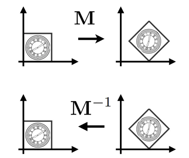 M⁻¹ 在矩阵和几何意义上都是变换 M 的逆。