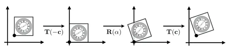 $$ T_{(1,0)} \cdot R_{45} \begin{bmatrix} x \\ y \\ 1 \end{bmatrix} = \begin{bmatrix} 1 & 0 & 1 \\ 0 & 1 & 0 \\ 0 & 0 & 1 \end{bmatrix} \begin{bmatrix} \cos 45^\circ & -\sin 45^\circ & 0 \\ \sin 45^\circ & \cos 45^\circ & 0 \\ 0 & 0 & 1 \end{bmatrix} \begin{bmatrix} x \\ y \\ 1 \end{bmatrix} = \begin{bmatrix} \cos 45^\circ & -\sin 45^\circ & 1 \\ \sin 45^\circ & \cos 45^\circ & 0 \\ 0 & 0 & 1 \end{bmatrix} \begin{bmatrix} x \\ y \\ 1 \end{bmatrix} $$- 变换顺序:矩阵从右到左依次应用