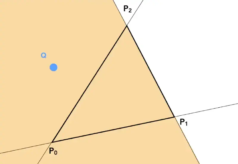 就像图中的 P 点,三个叉乘结果都为正,说明它始终在所有边的同一侧。
