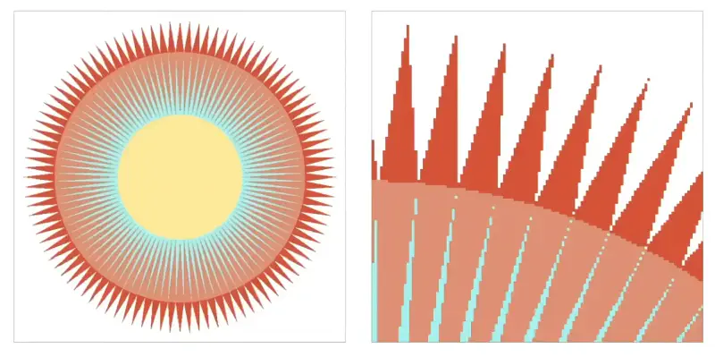 屏幕由离散像素组成,无法精确表示连续曲线 → 导致边缘出现“楼梯状”锯齿。