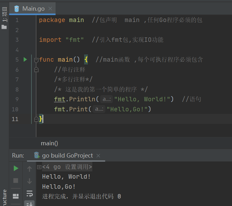 /* 这是我的第一个简单的程序 */ fmt.Println("Hello, World!") //语句